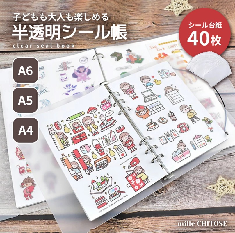 楽天で『A5 6穴 シール帳 半透明』で検索して『mille CHITOSE』というショップで買いました。